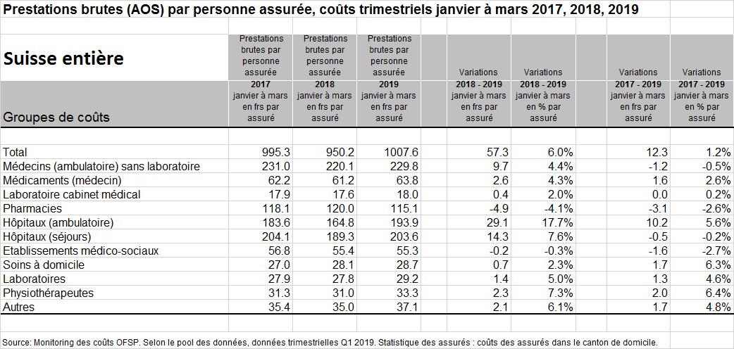 En vérité, comme indiqué dans un communiqué de presse de la Société vaudoise de médecine (SVM) précédant d’une semaine celui de Comparis, les coûts de la santé à charge de l’AOS n’ont augmenté en Suisse que de 1,2% entre les premiers trimestres réellement comparables de 2017 et 2019 [5].