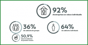 Malgré cette augmentation, la part des cabinets médicaux faisant partie d’un cabinet de groupe reste minoritaire. Par contre, la part de cabinets de groupe dans la médecine de 1er recours est de 50,9%, alors qu’elle n’est que de 25,4% dans la médecine spécialisée et 34,1% dans des cabinets à offre mixte.